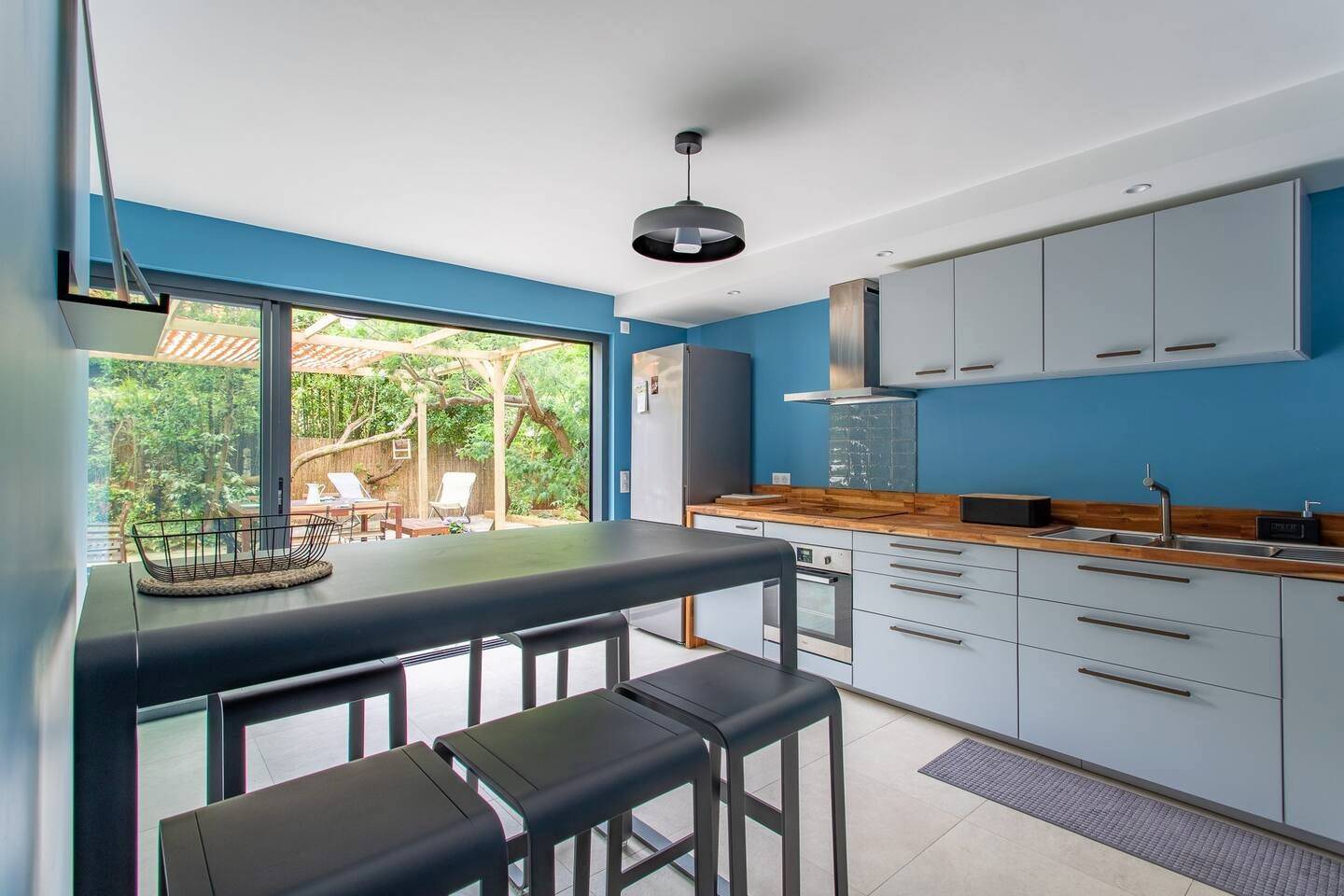 Elle est entourée d’un superbe jardin clos et arboré de 800 m², comprenant une agréable terrasse aménagée, une pergola, une plancha/barbecue WEBER au gaz, ainsi qu’une douche extérieure avec eau chaude et froide idéale pour le retour de plage.