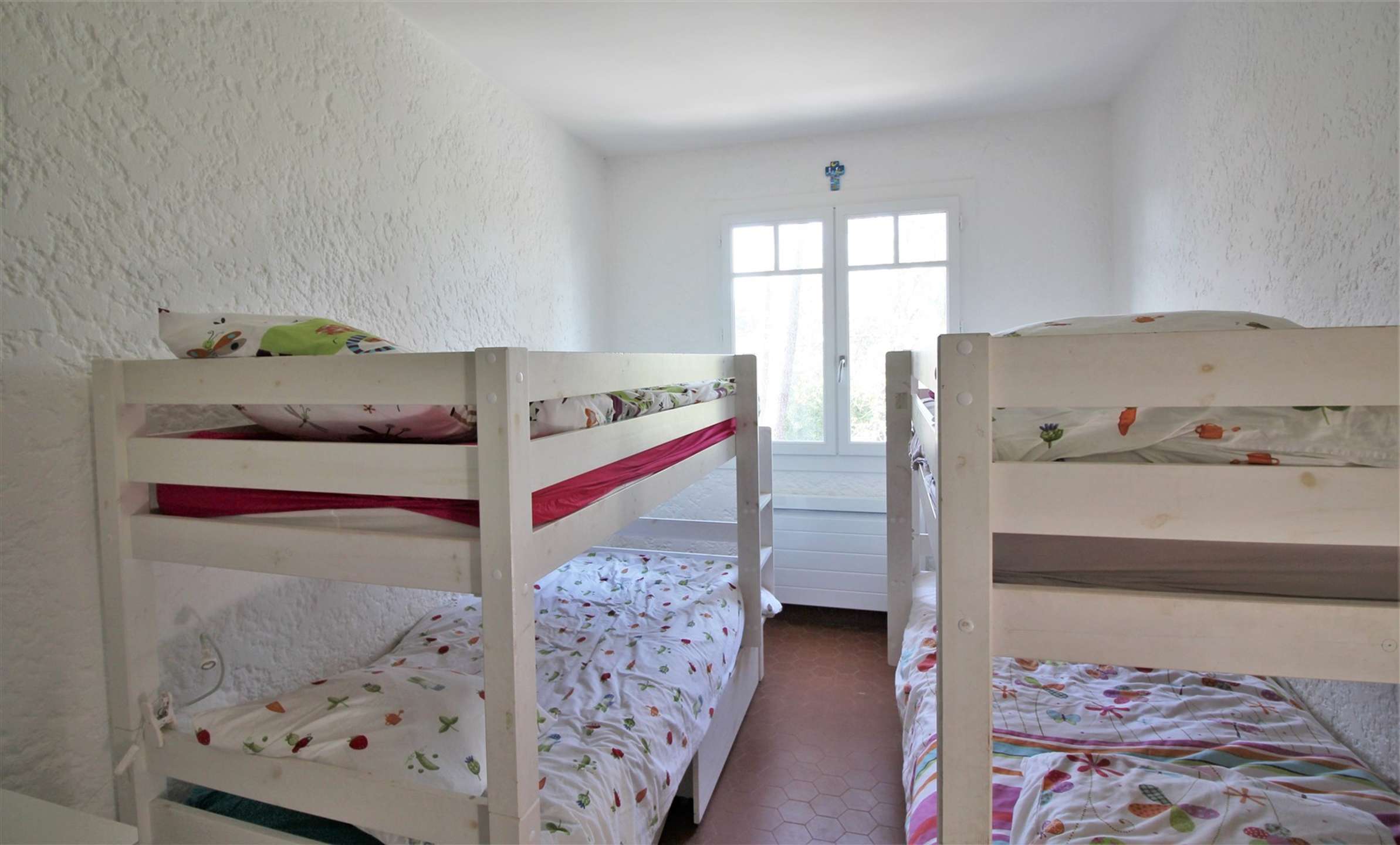 Pour finir ce niveau, cette villa dispose de deux chambres avec lits en 140 dont une suite parentale offrant une vue sur le Bassin et dotée d’une salle d’eau, une chambre avec deux lits superposés 90 soit 4 couchages. De plus, une salle de bain et un WC séparé sont à votre disposition.
