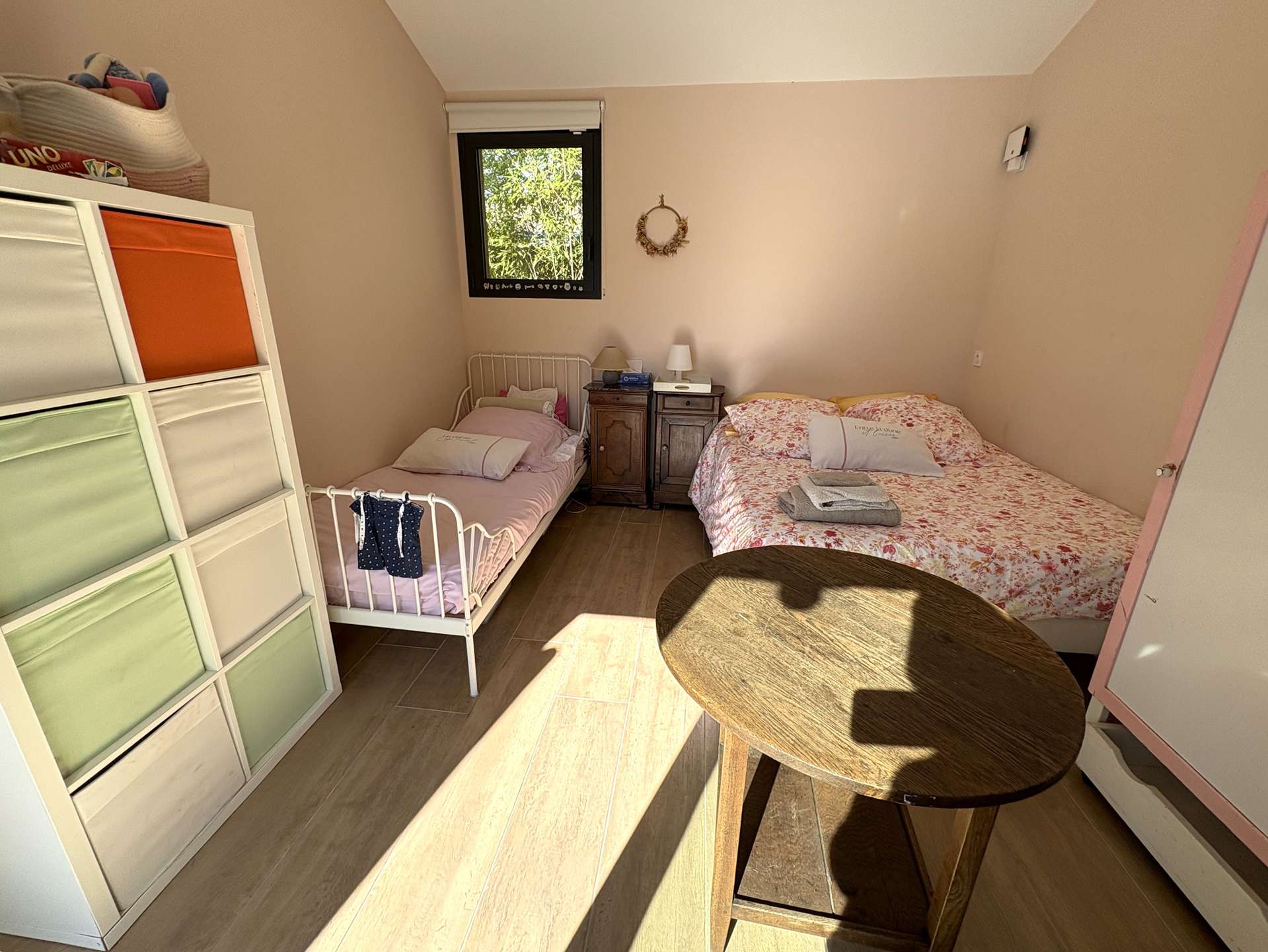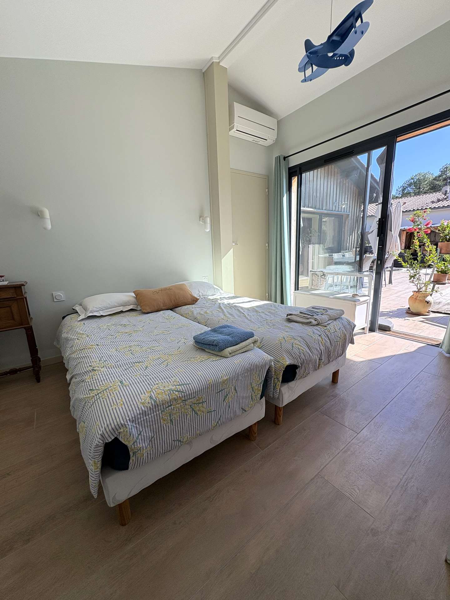 D’une superficie d’environ 170 m², la villa propose un vaste salon-séjour traversant lumineux et climatisé, ouvert sur une cuisine contemporaine entièrement équipée. De larges baies vitrées prolongent les pièces de vie vers une belle terrasse exposée plein ouest, où trône une piscine au sel, chauffée et sécurisée, véritable invitation à la détente. L’espace nuit se compose de cinq chambres, dont deux équipées de lits queen-size (160 cm), deux chambres avec deux lits simples (80 cm) modulables en 160 cm, une salle de bain avec douche, 2 salles d’eau et 4 WC.