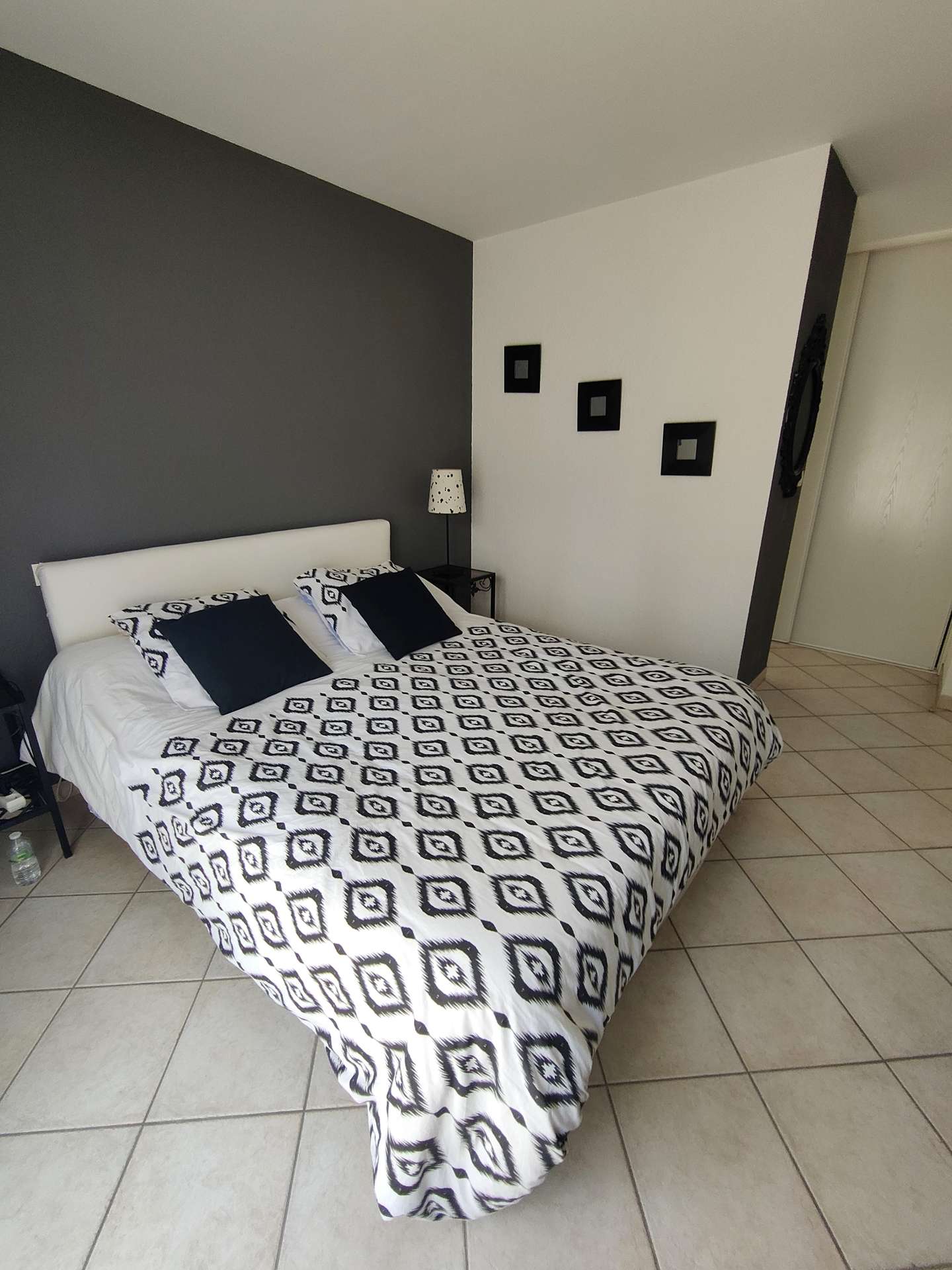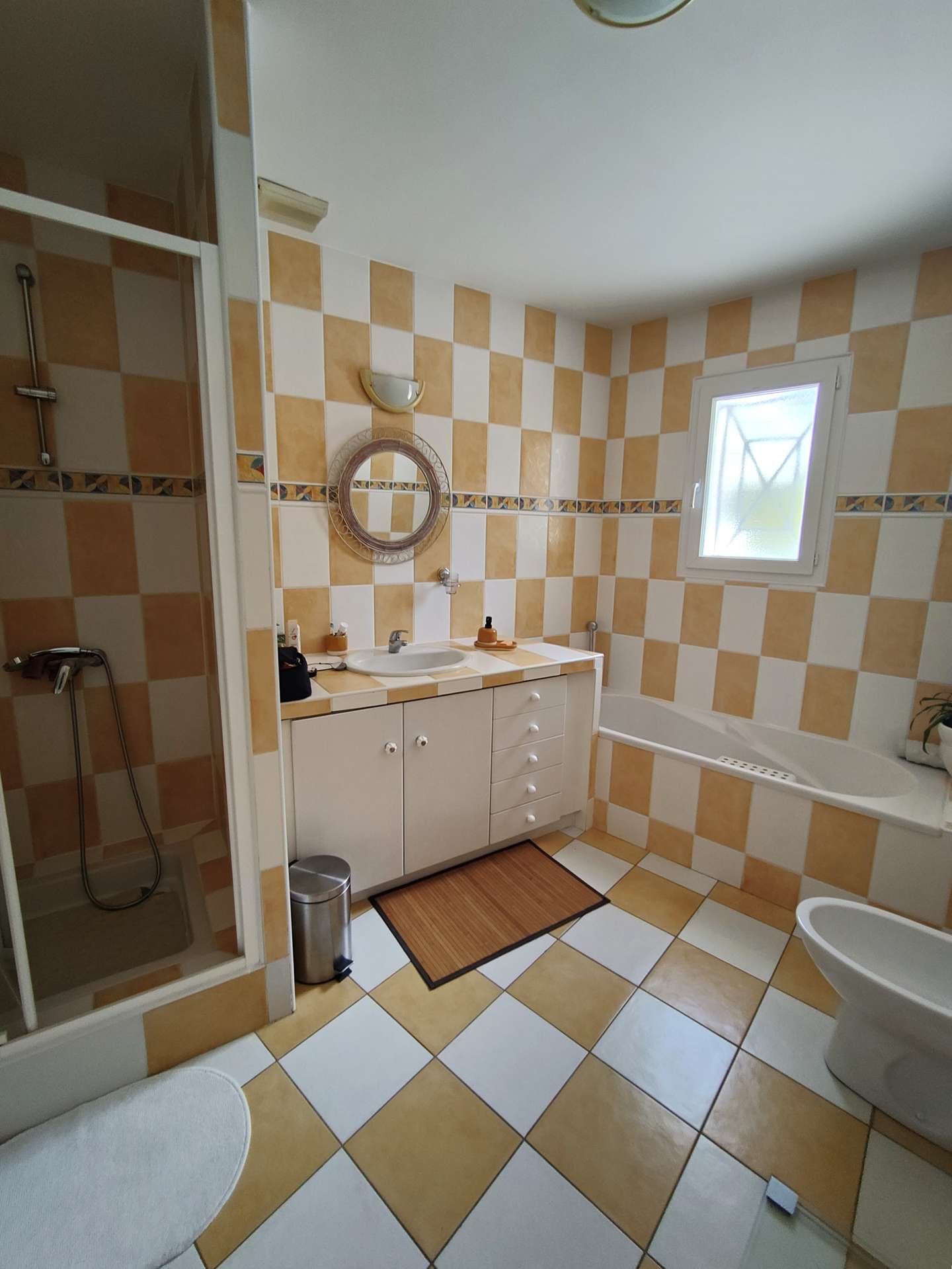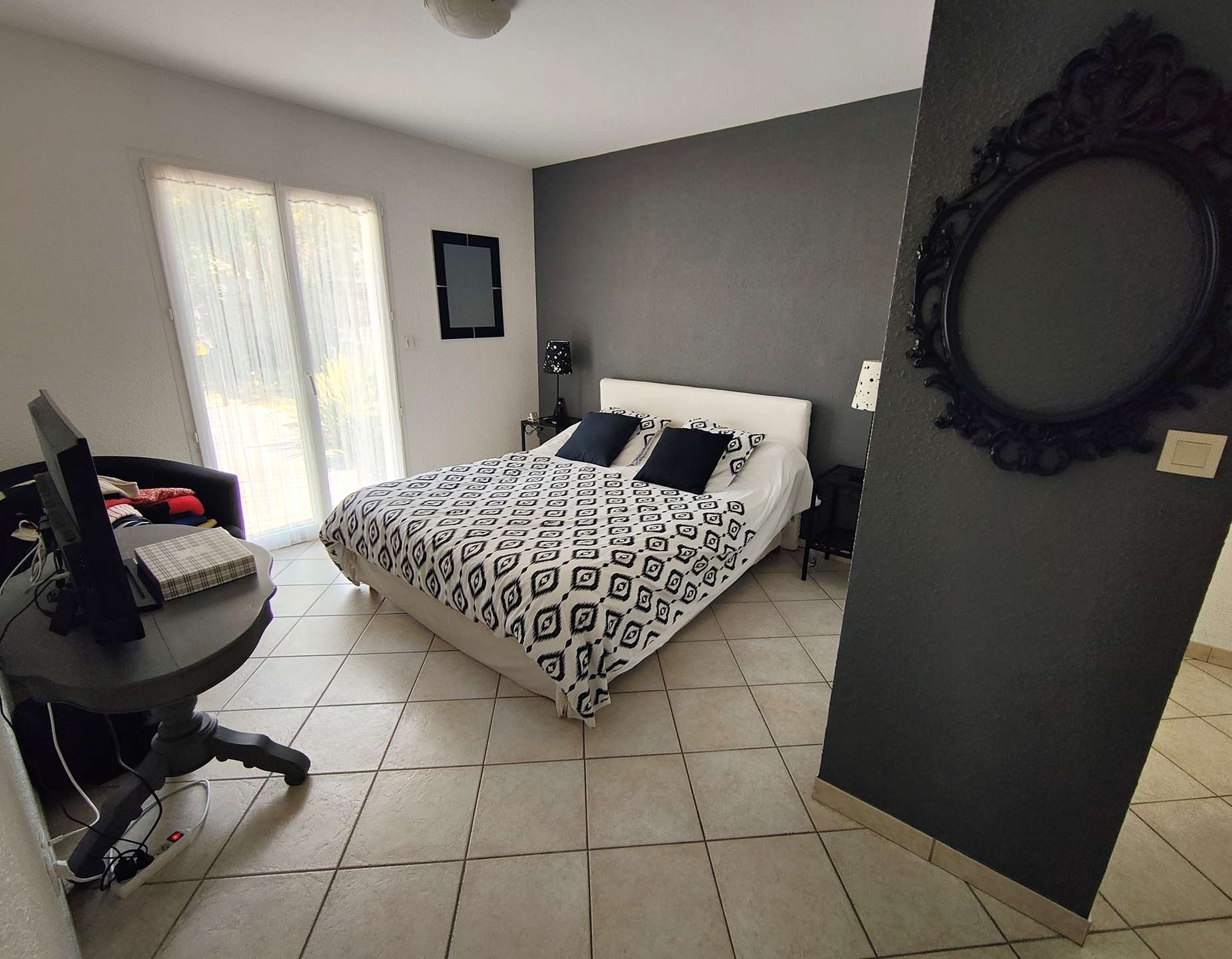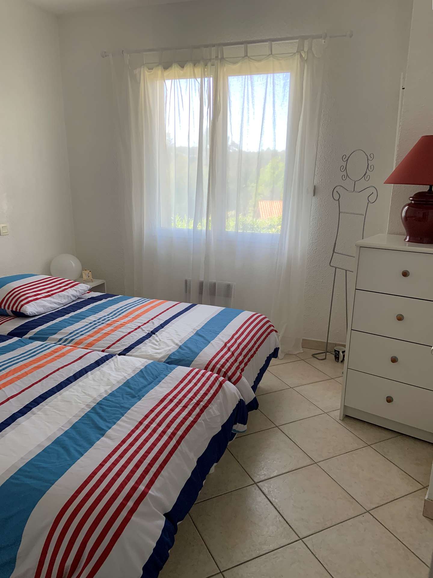 Ensuite cette villa offre 2 chambres avec des lits en 160, une chambre avec 2 lits en 90, une salle de bain avec une douche et un WC indépendant.