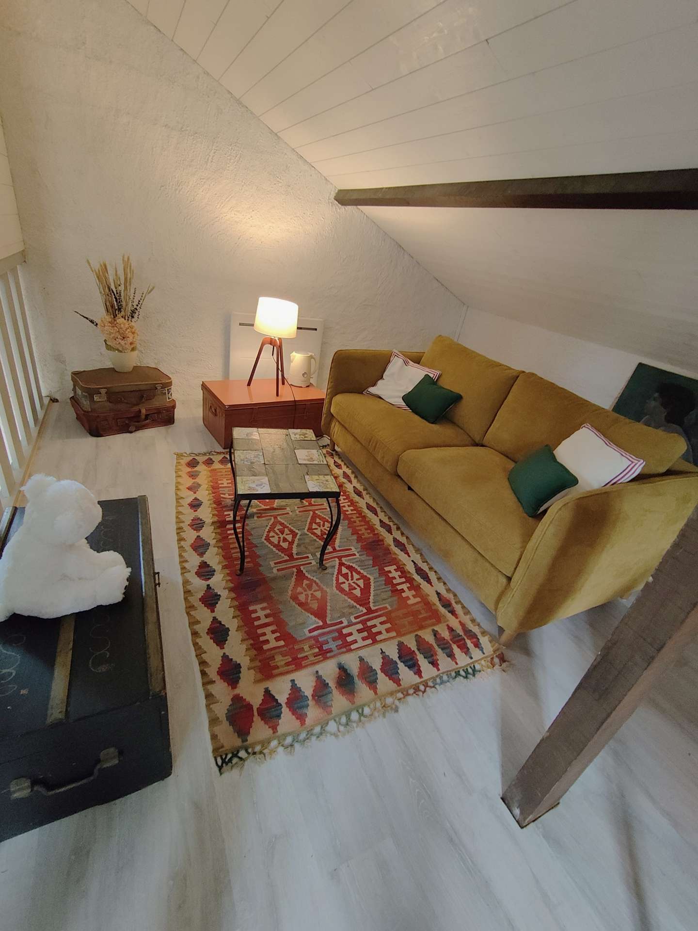 A l’étage elle dispose d’une chambre avec un lit en 160, un coin détente équipé d’un canapé convertible en 140 et un espace dédié aux jeux.