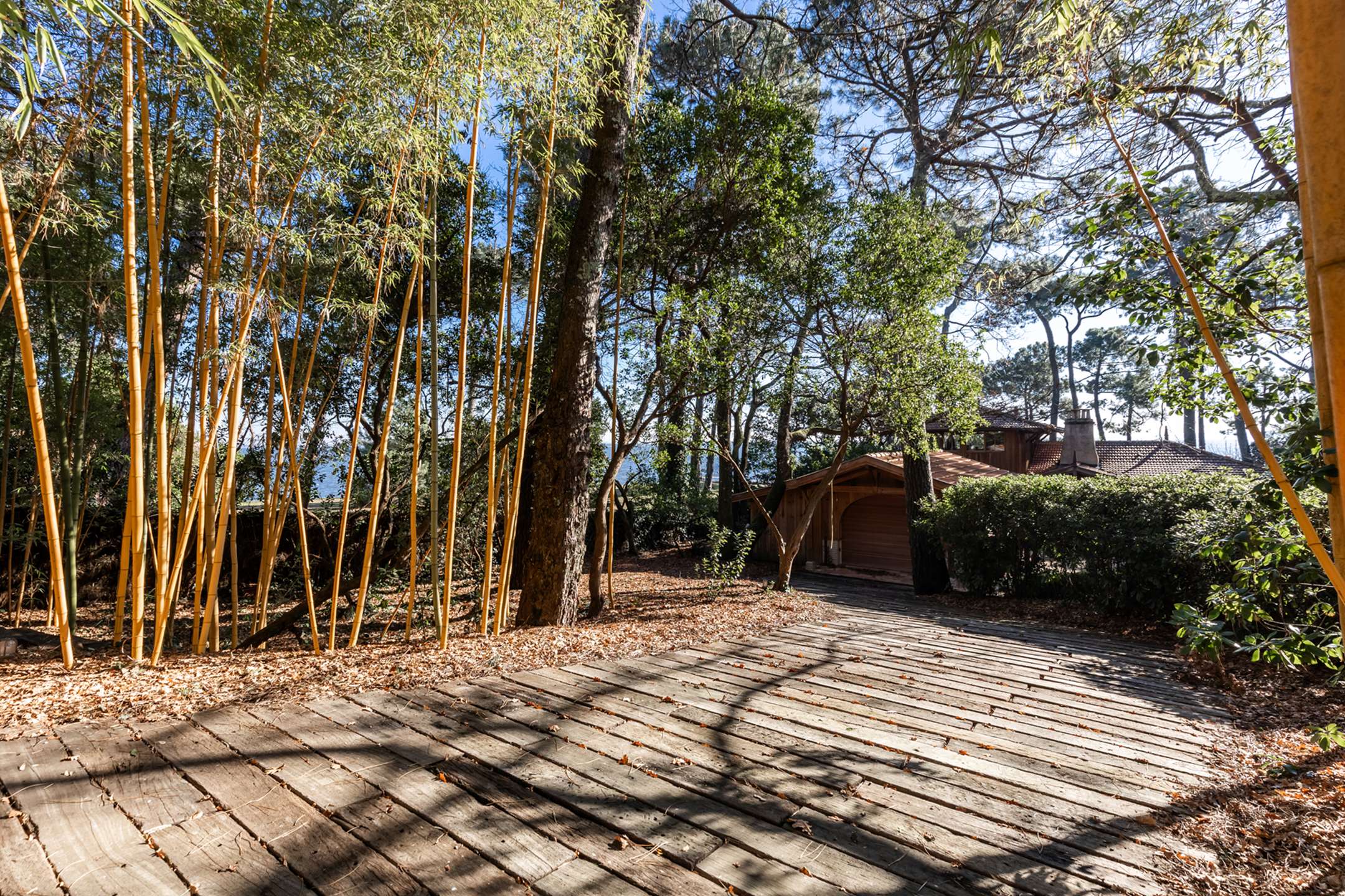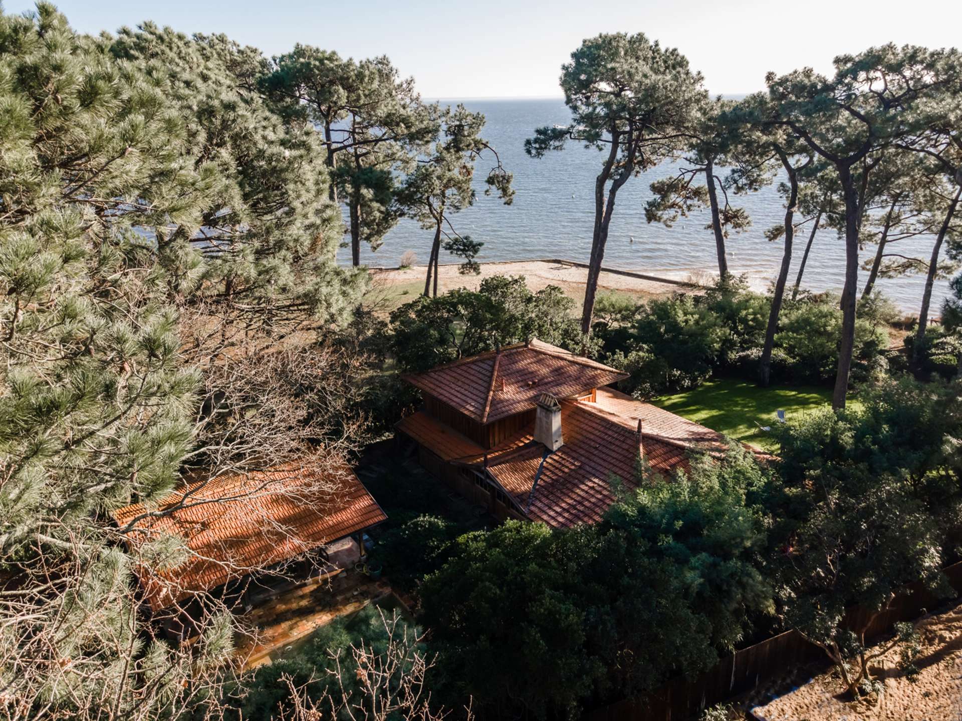 La villa principale qui comprend un grand salon – salle à manger lumineux ouvert sur la terrasse, une cuisine américaine spacieuse, 3 suites parentales (chambre, salle d’eau et WC) dont une à l’étage avec sa terrasse privative bénéficiant d’une vue Bassin à couper le souffle. A l’étage inférieur se trouve la salle de cinéma, la buanderie ainsi qu’une salle d’eau avec WC.