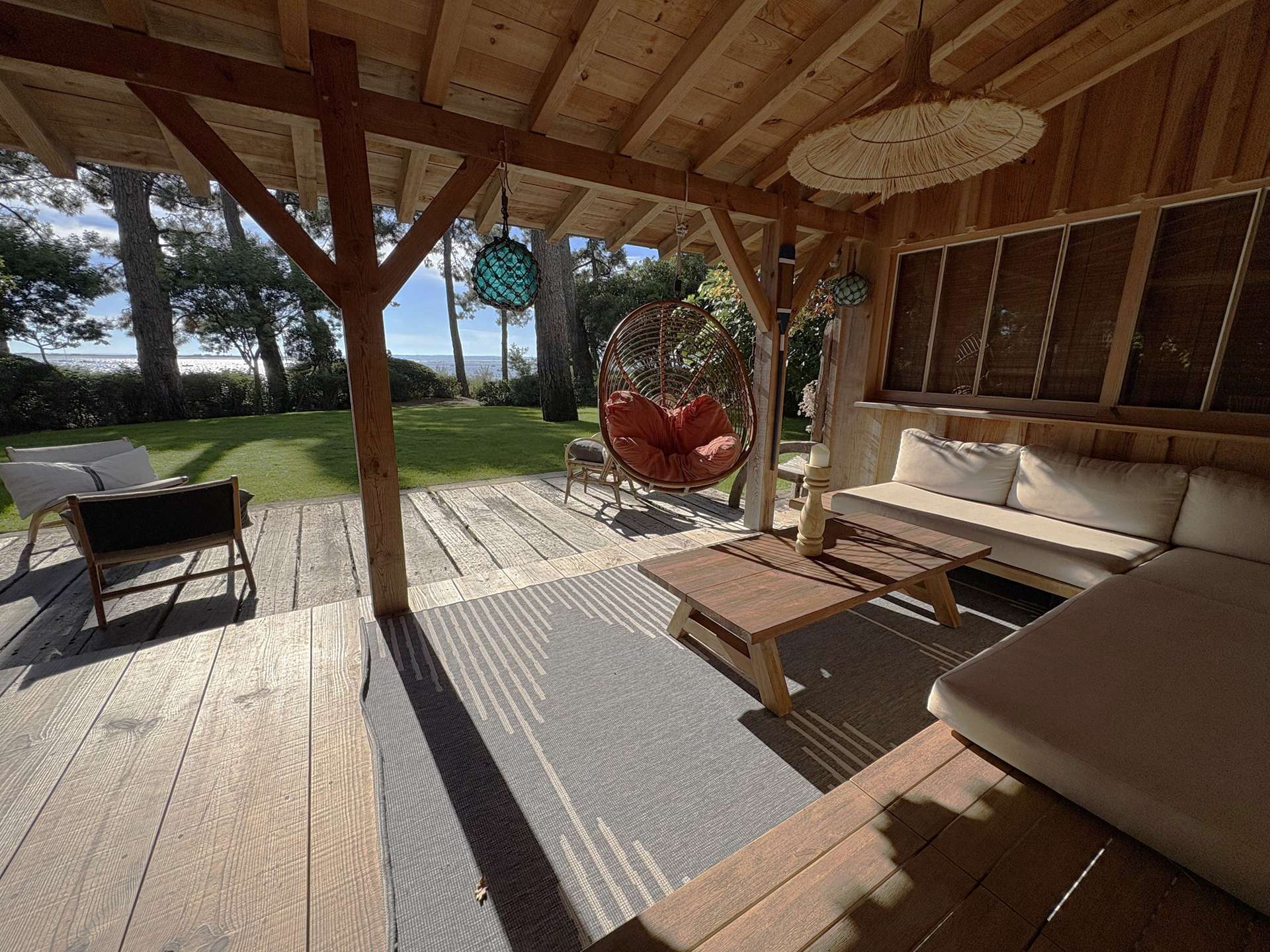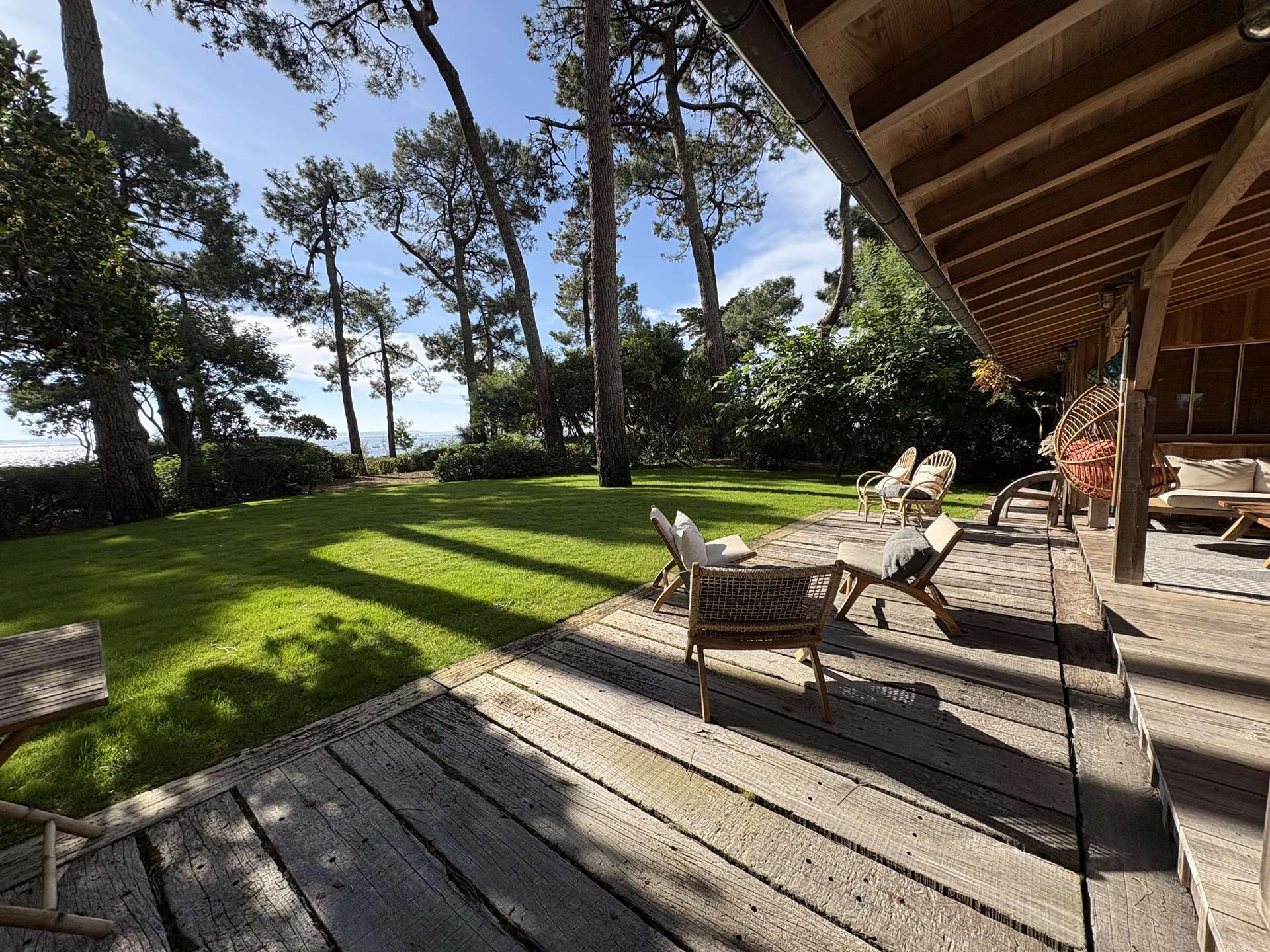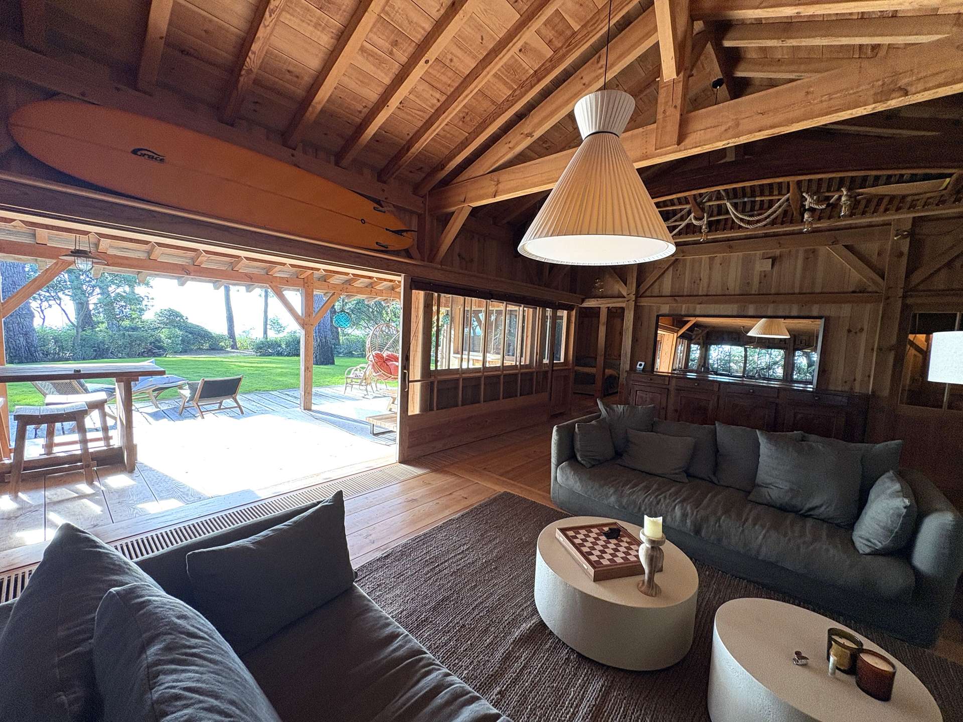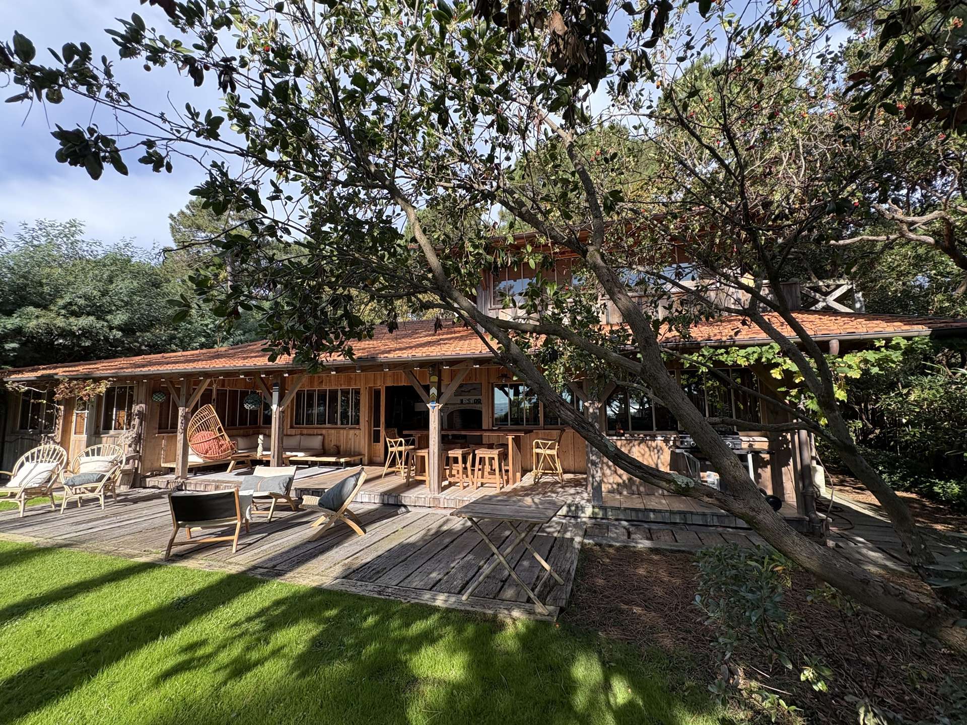 Installée sur un terrain arboré de 2375 m², elle dispose d’une grande terrasse avec plancha pour des repas en famille ou entre amis, un salon de jardin, chaises longues et douche extérieure, parfaite pour profiter pleinement de l’extérieur après une journée à la plage.