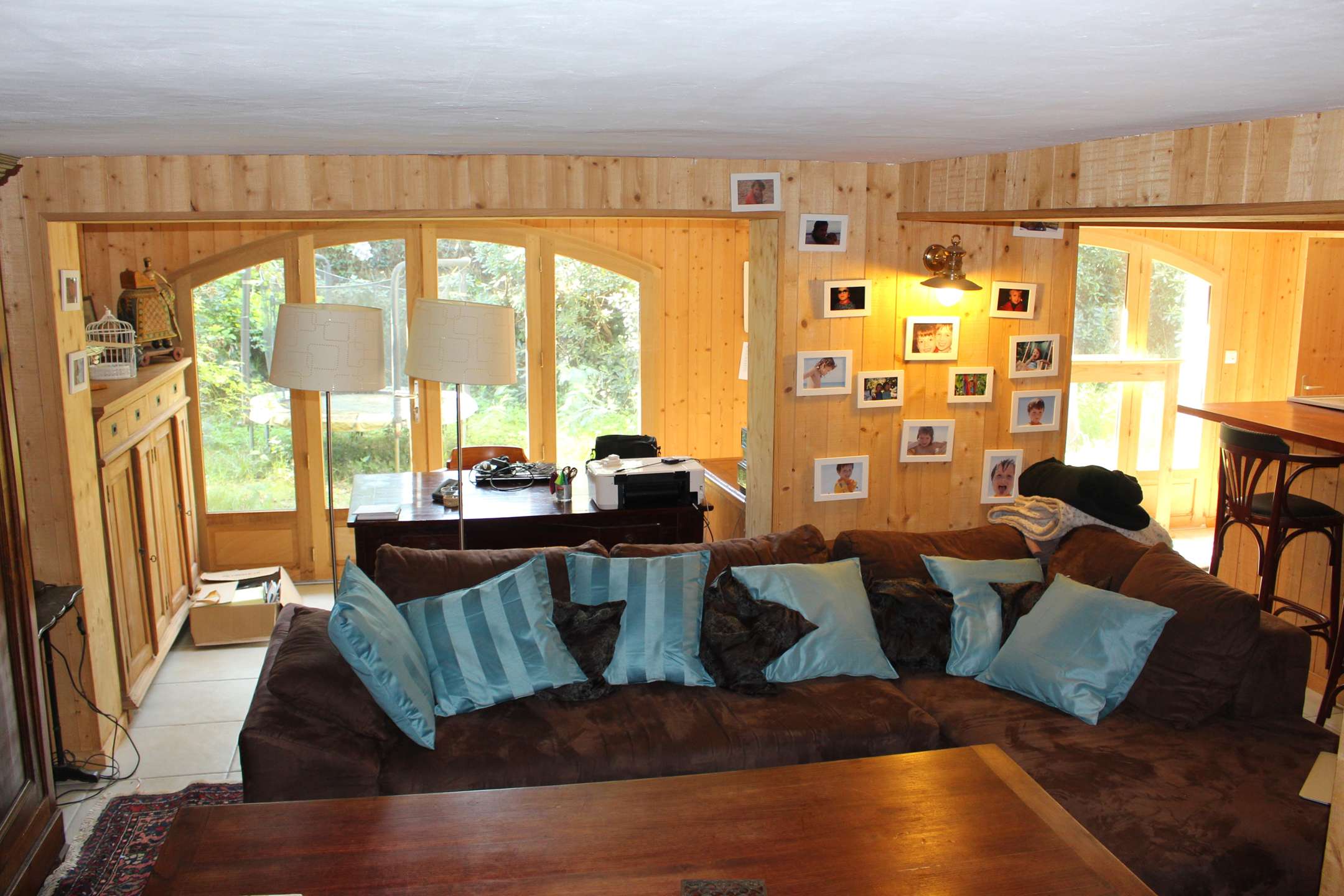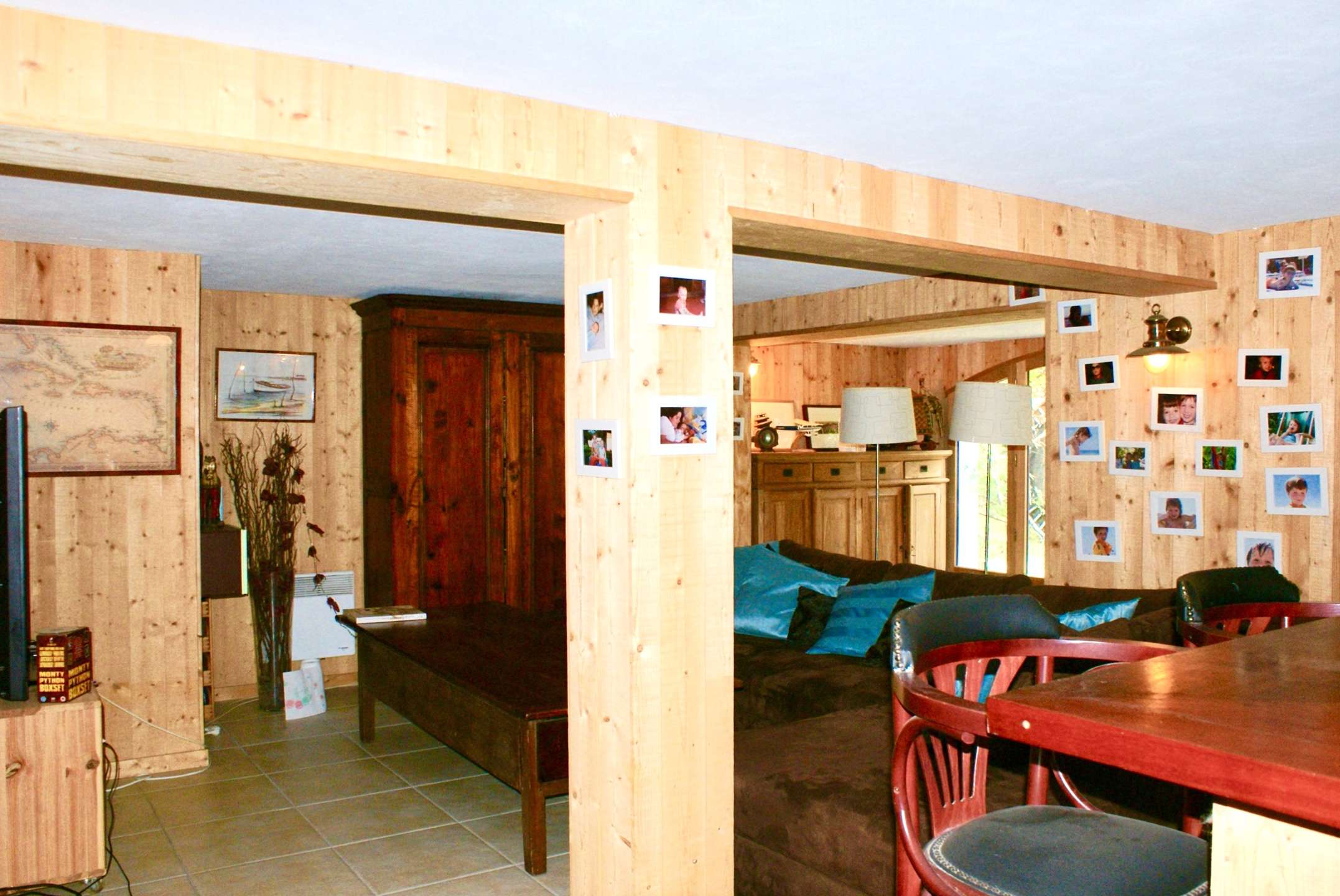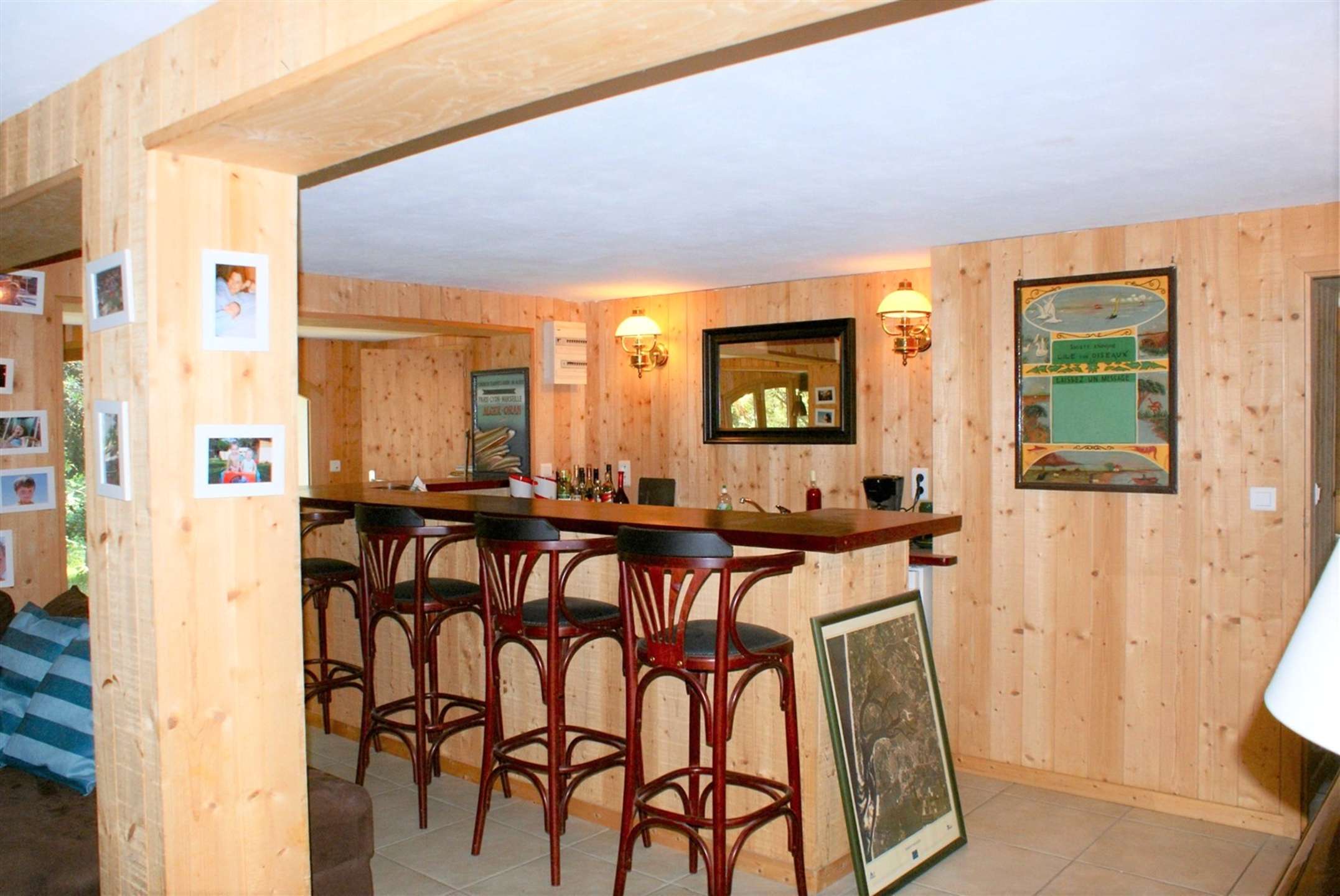 Au RDJ : Un salon/séjour avec bar ouvert sur le salon, équipé d’une télévision, d’un babyfoot et d’un piano désaccordé…..