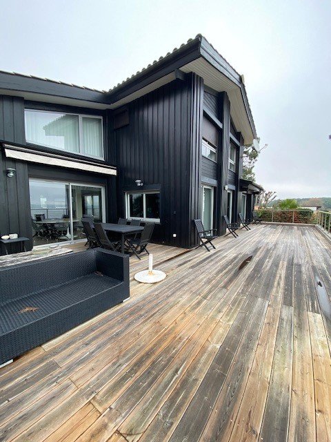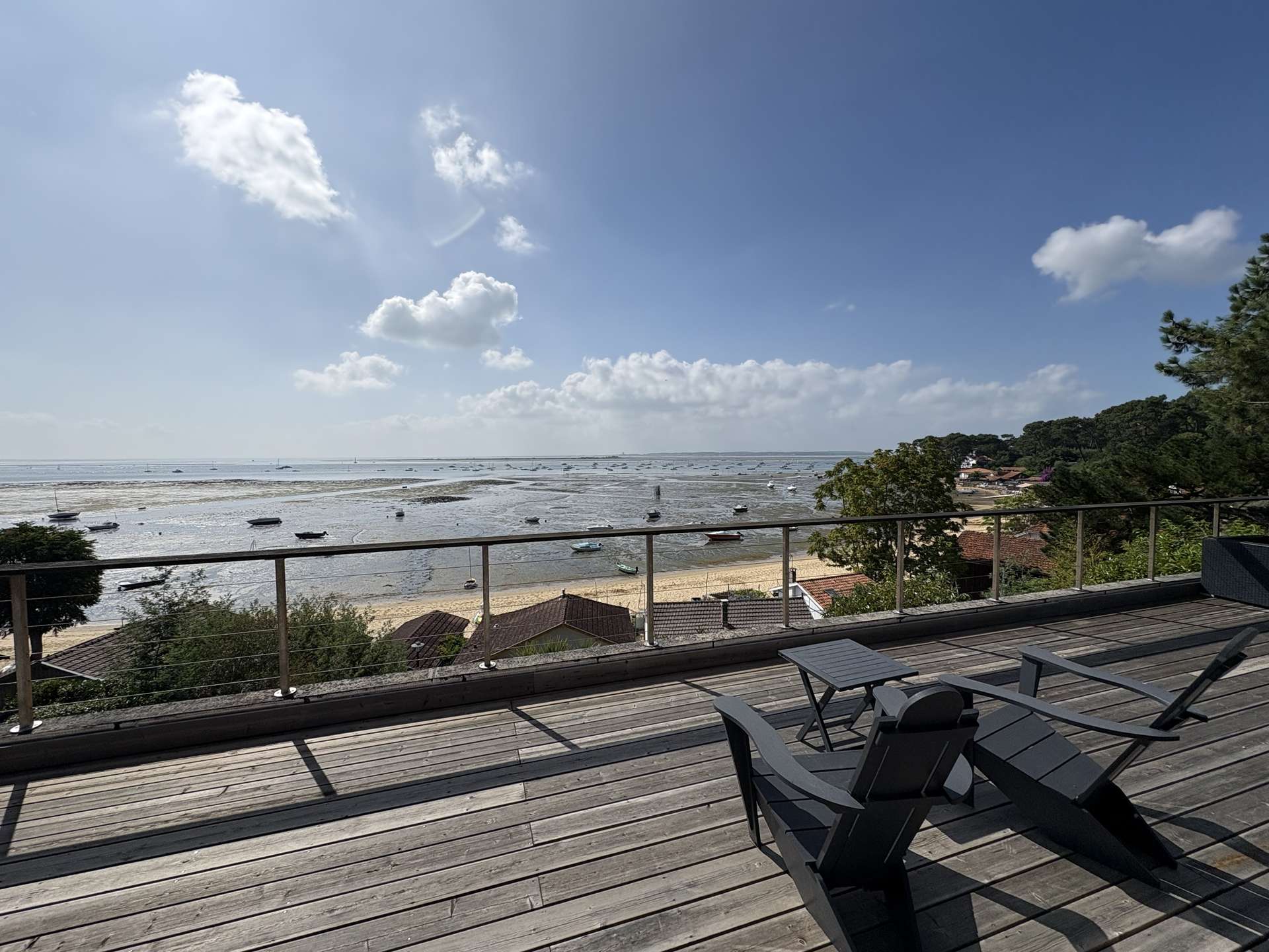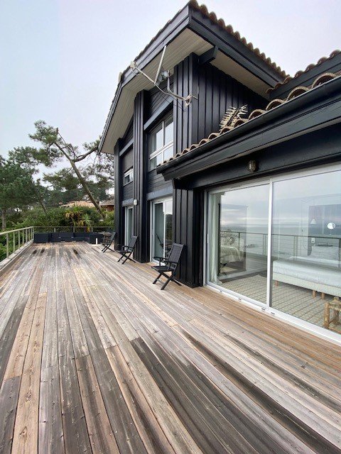 Cette villa possède deux superbes terrasses : l’une orientée Sud-Ouest, avec piscine chauffée, et l’autre orientée Sud, avec une vue imprenable sur le Bassin d’Arcachon, d’où l’on distingue l’île aux Oiseaux et Arcachon.