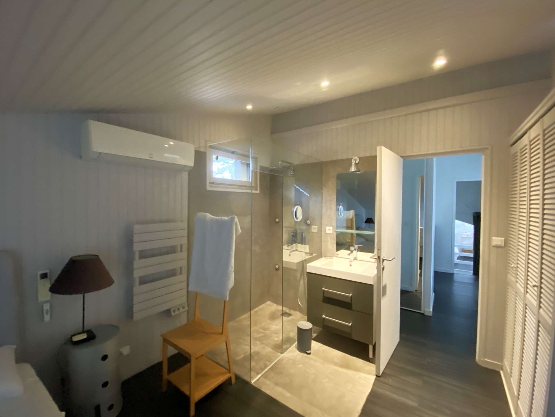 A l’étage, la villa bénéficie de quatre chambres avec vue sur le Bassin. Trois sont équipés d’un brasseur d’air, tandis que la suite parentale bénéficie de la climatisation. La première chambre comprend un lit en 180, la seconde un lit en 160 avec télévision, la troisième un lit en 180 avec télévision, et la suite parentale dispose d’un lit en 180 ainsi que d’une salle d’eau privative. Une salle d’eau supplémentaire et un WC viennent compléter l’ensemble.
